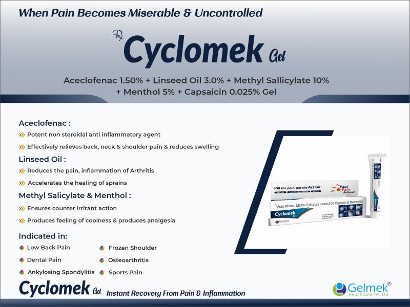 | Composition: | Aceclofenac (1.50% w/w) + Linseed Oil (3.0% w/w) + Methyl Salicylate (10% w/w) + Menthol (5% w/w) + Capsaicin (0.025% w/w) |