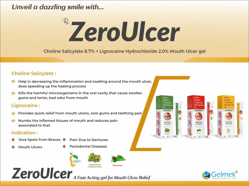 | Composition: | Choline Salicylate 8.7%w/w + Lignocaine 2%w/w Mouth Ulcer Gel - Mango Flavour, Peppermint & Cardemom Flavour, Paan Flavour |